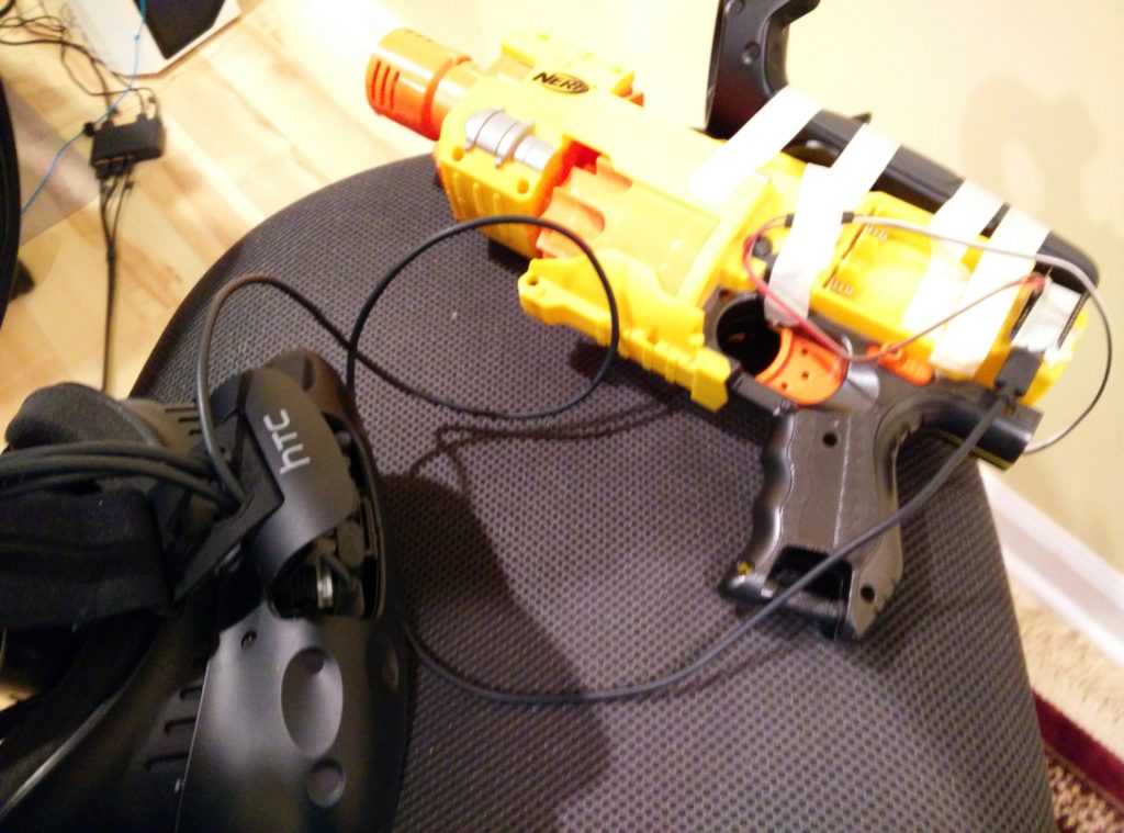 Modding a Nerf Barricade into an HTC Vive tracked controller — a digital trigger wired to an Arduino gives real tactile feedback in VR.